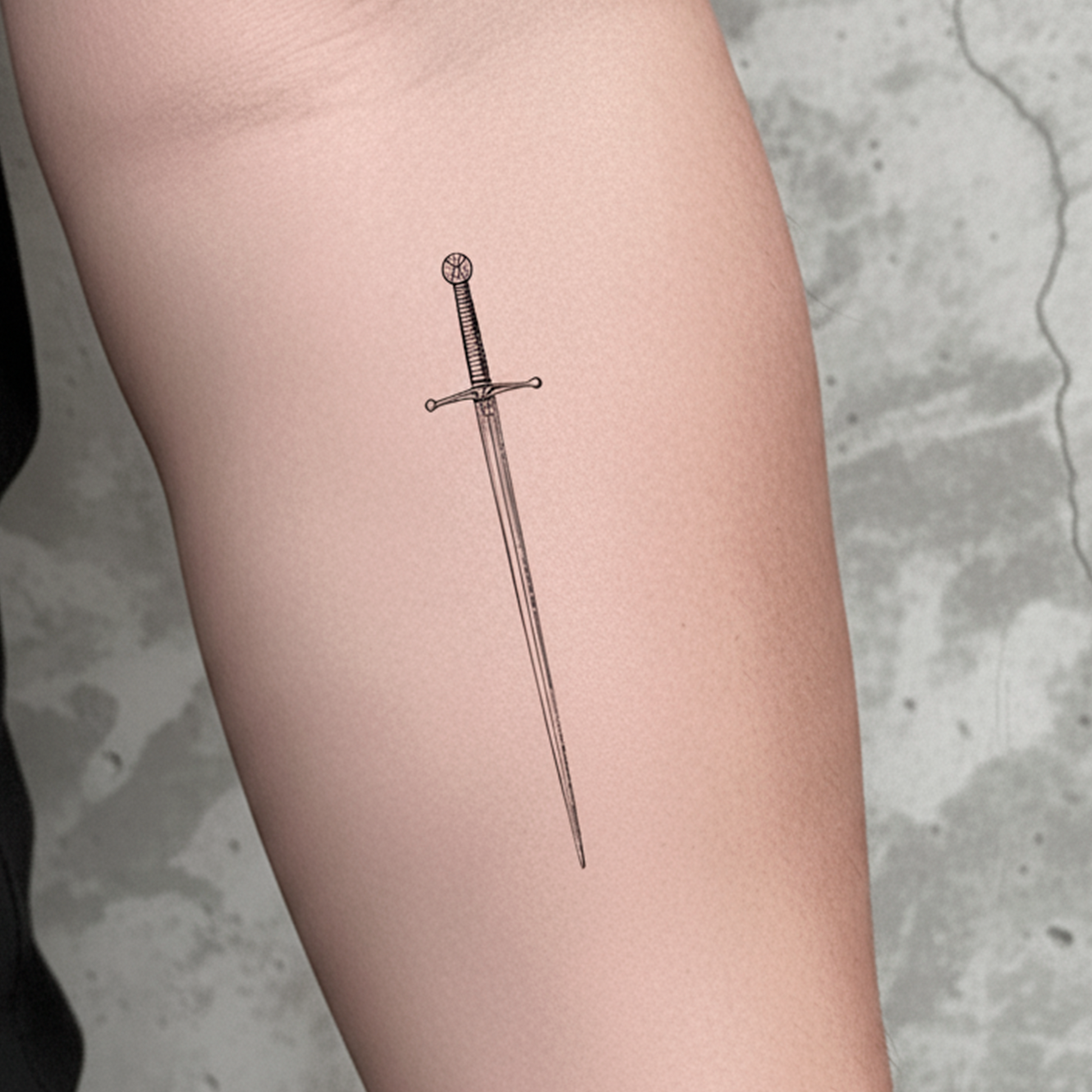 Su diseño minimalista y detallado evoca elegancia y disciplina, con una estética sobria que transmite control y propósito. Resistente al agua y duradero hasta dos semanas, este tatuaje es ideal para quienes viven con enfoque, fuerza y una mentalidad afilada.