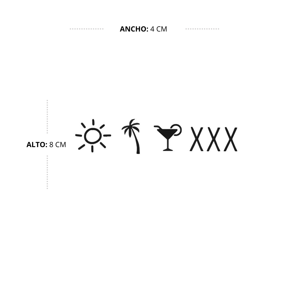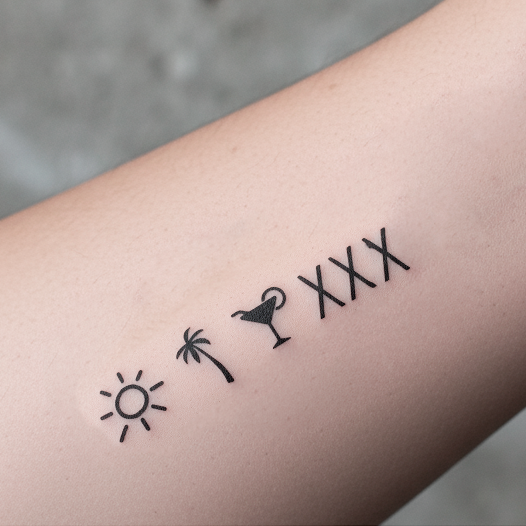 Diseñado con símbolos minimalistas sol, palma, copa y besos este tatuaje es una oda a los placeres simples y a la independencia silenciosa.