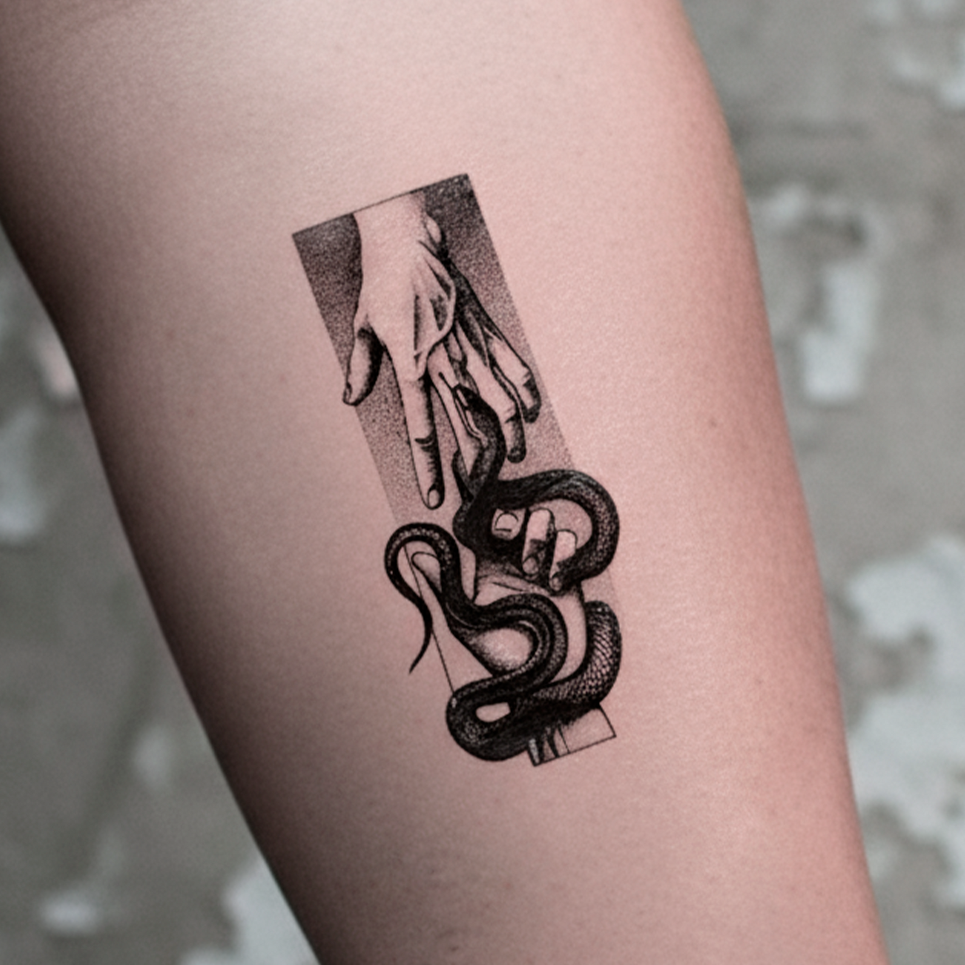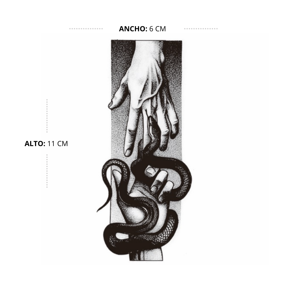 Su diseño muestra dos manos entrelazadas con una serpiente, símbolo del vínculo entre lo divino y lo terrenal, la pureza y la tentación.Resistente al agua y con duración de hasta dos semanas, es el tatuaje perfecto para quienes creen que incluso en el pecado hay belleza, y que la caída también puede ser un acto de libertad.