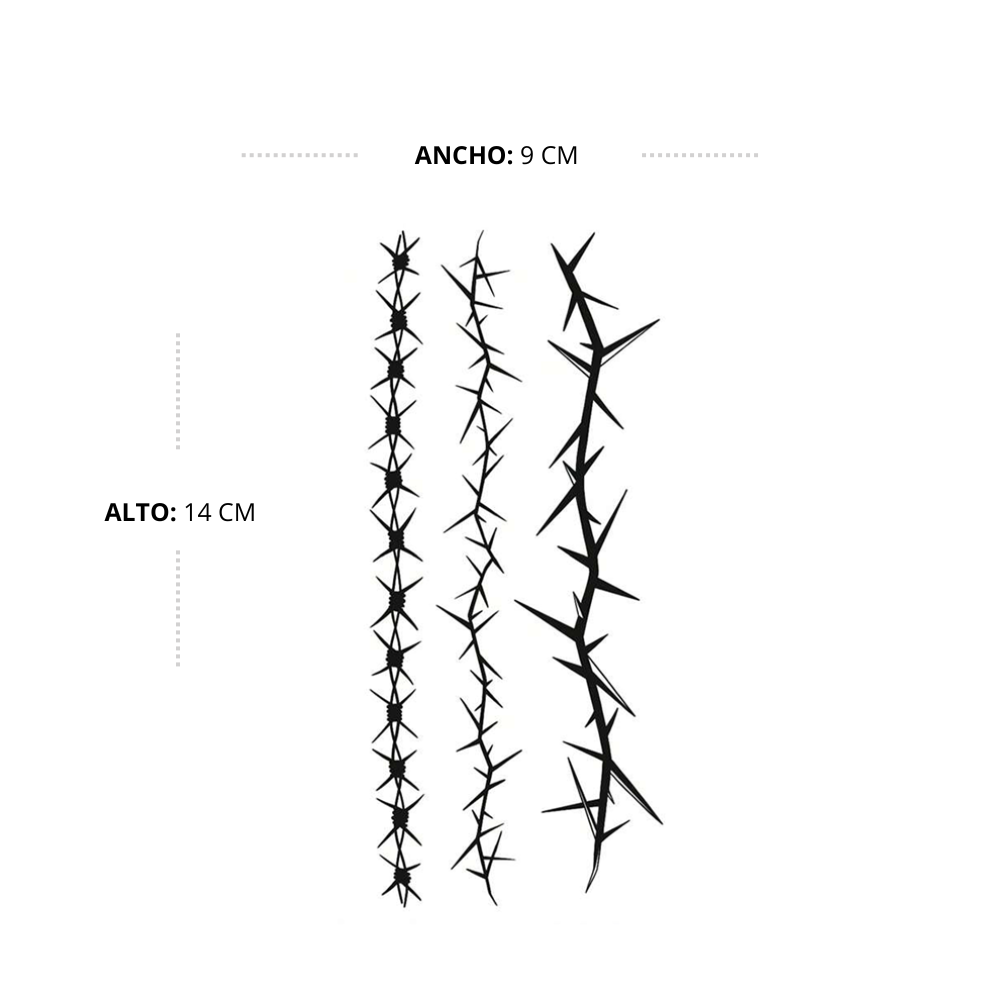 ¡Despierta tu lado más audaz con nuestro tatuaje temporal de Espinas Triples!  Este diseño impactante es un símbolo de protección, resistencia y una fuerza inquebrantable. Perfecto para quienes no temen destacar y quieren llevar consigo un recordatorio visual de su capacidad para superar cualquier desafío.