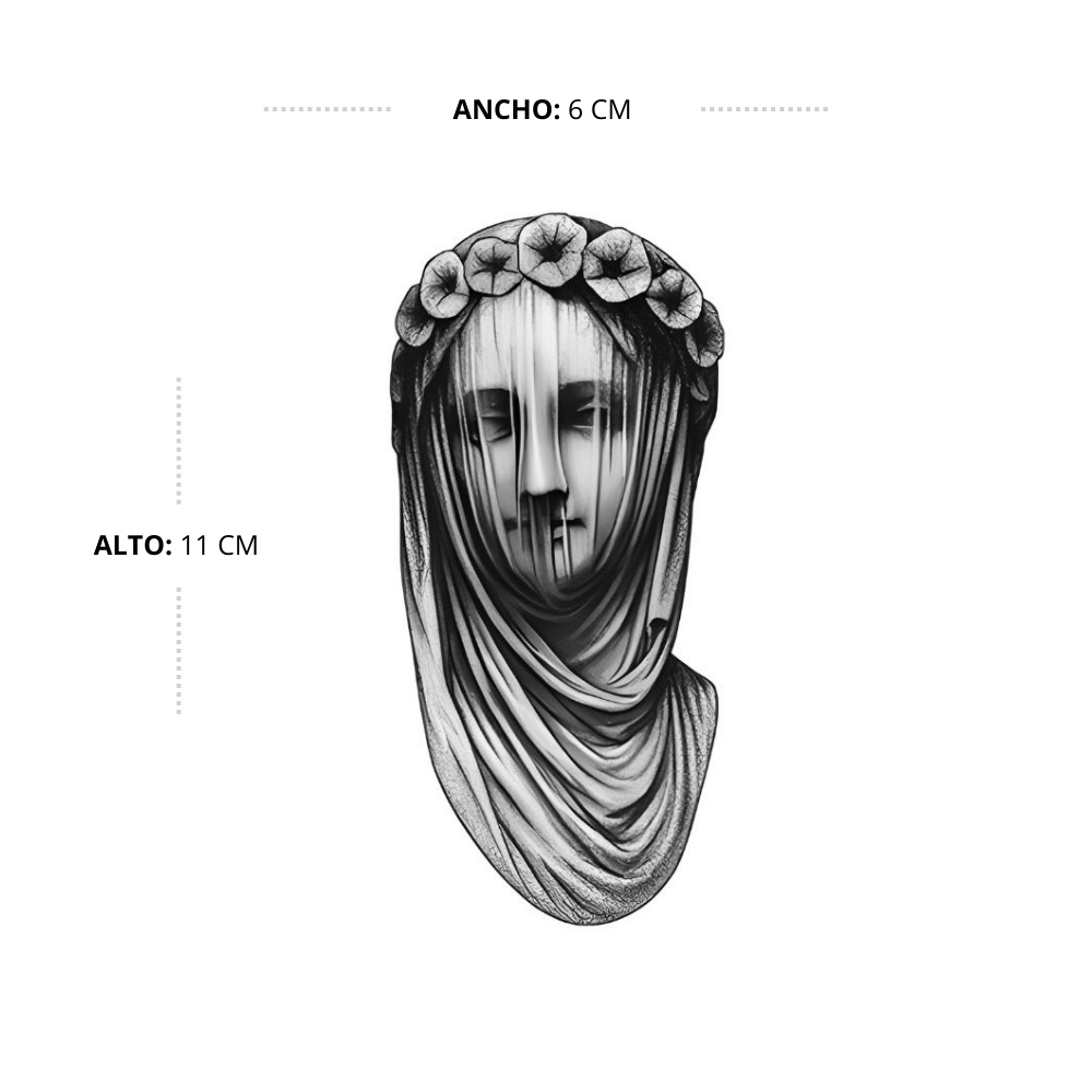 Su diseño, basado en esculturas clásicas veladas, transmite pureza, fuerza interior y una belleza atemporal reinterpretada en clave urbana. Resistente al agua y duradero hasta por dos semanas, este tatuaje es ideal para quienes entienden que el verdadero poder se demuestra en silencio.
