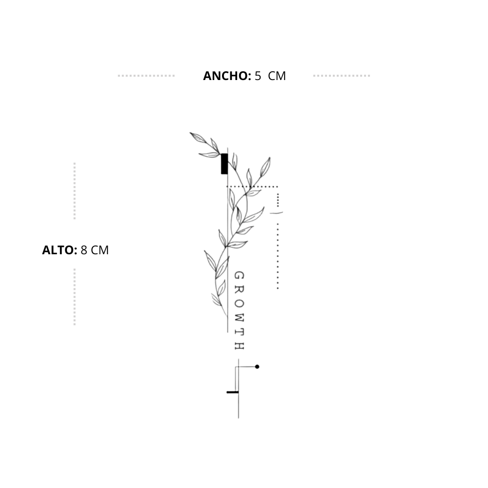Este tatuaje combina la delicadeza orgánica de la naturaleza con la estructura de un diseño conceptual. La rama que asciende junto a la palabra representa la evolución constante y el florecimiento personal. Es una pieza ideal para quienes han atravesado procesos de transformación y desean llevar consigo un símbolo de su propia resiliencia y expansión.