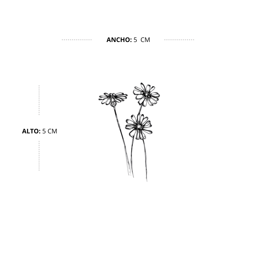 Este ramillete de trazo fino evoca pureza, sencillez y nuevos comienzos. Las margaritas, con sus tallos entrelazados, representan la belleza de lo natural y la alegría de los pequeños detalles. Es un diseño que transmite frescura y una conexión genuina con la tierra, ideal para personalidades alegres y transparentes.